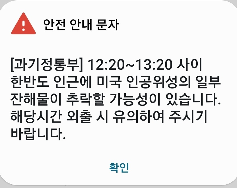 오늘 12시 20분 ~ 1시 20분 사이에 잔해물이 추락할 가능성이 있다고 하니 외출할 때 조심하세요.