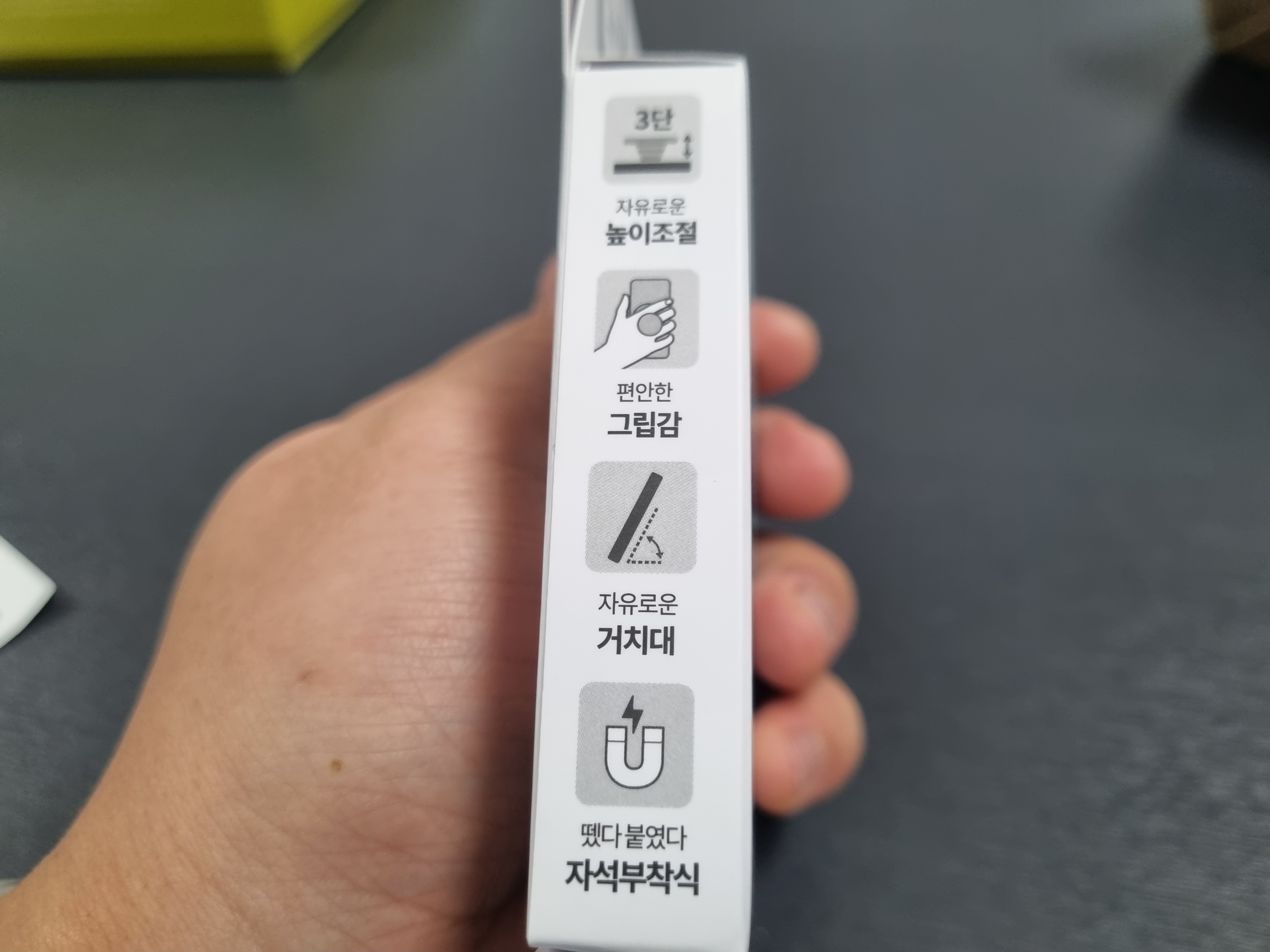3단으로 펼 수 있게 되어 있어서 자유롭게 높이조절을 할 수 있고, 주머니에 넣거나 들고다니기도 편해요. 또한 무선충전 하거나 어딘가에 거치할 때는 맥세이프 그립톡이라 쉽게 떼어낼 수 있다는 점도 장점이죠. 또한 거치기능이 가능하여 필요할 때 쫙 펴서 사용할 수 있어요.