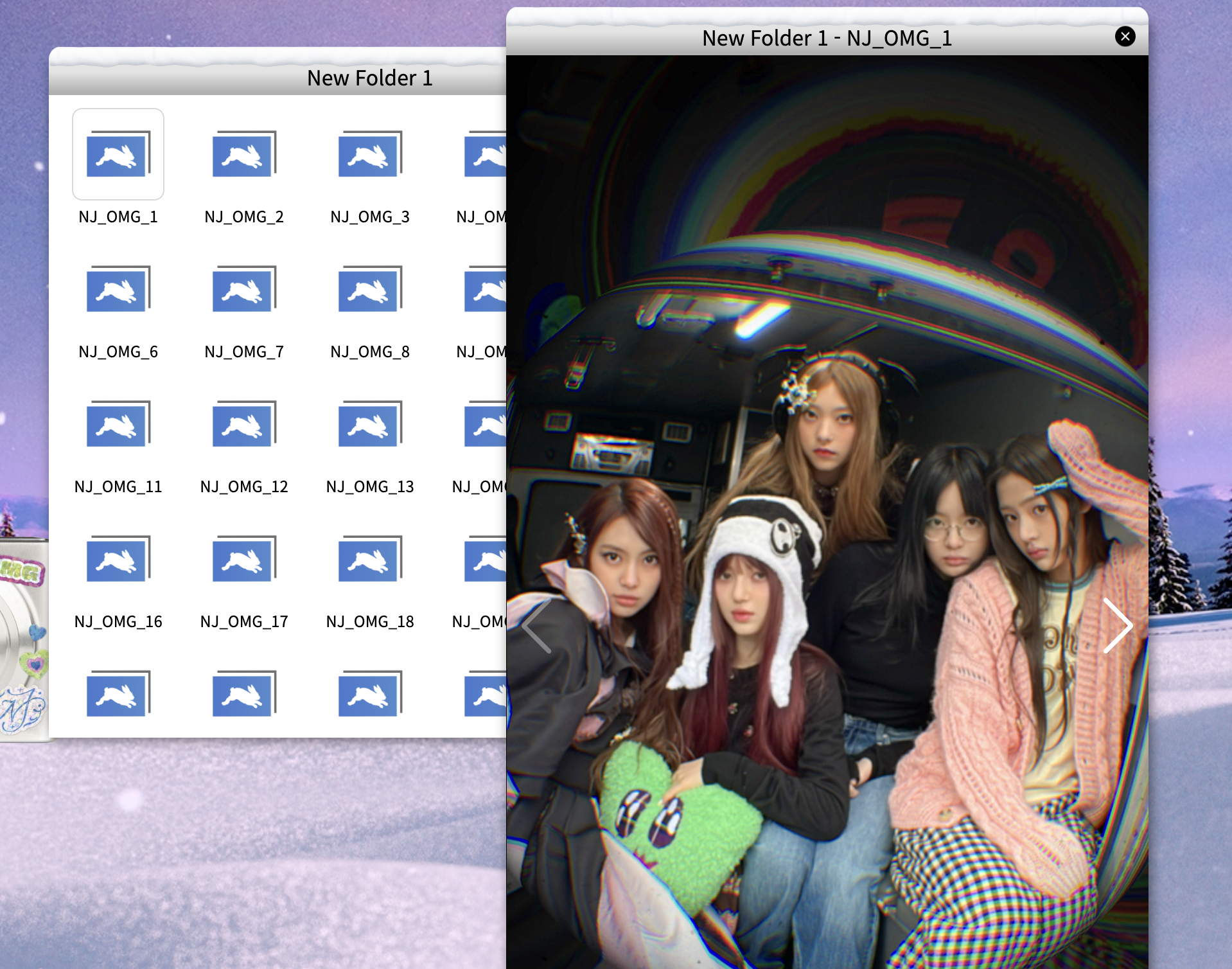 윈도우와 같은 구성이 있고, 폴더를 들어가면 뉴진스 사진과 영상들을 볼 수 있습니다.
