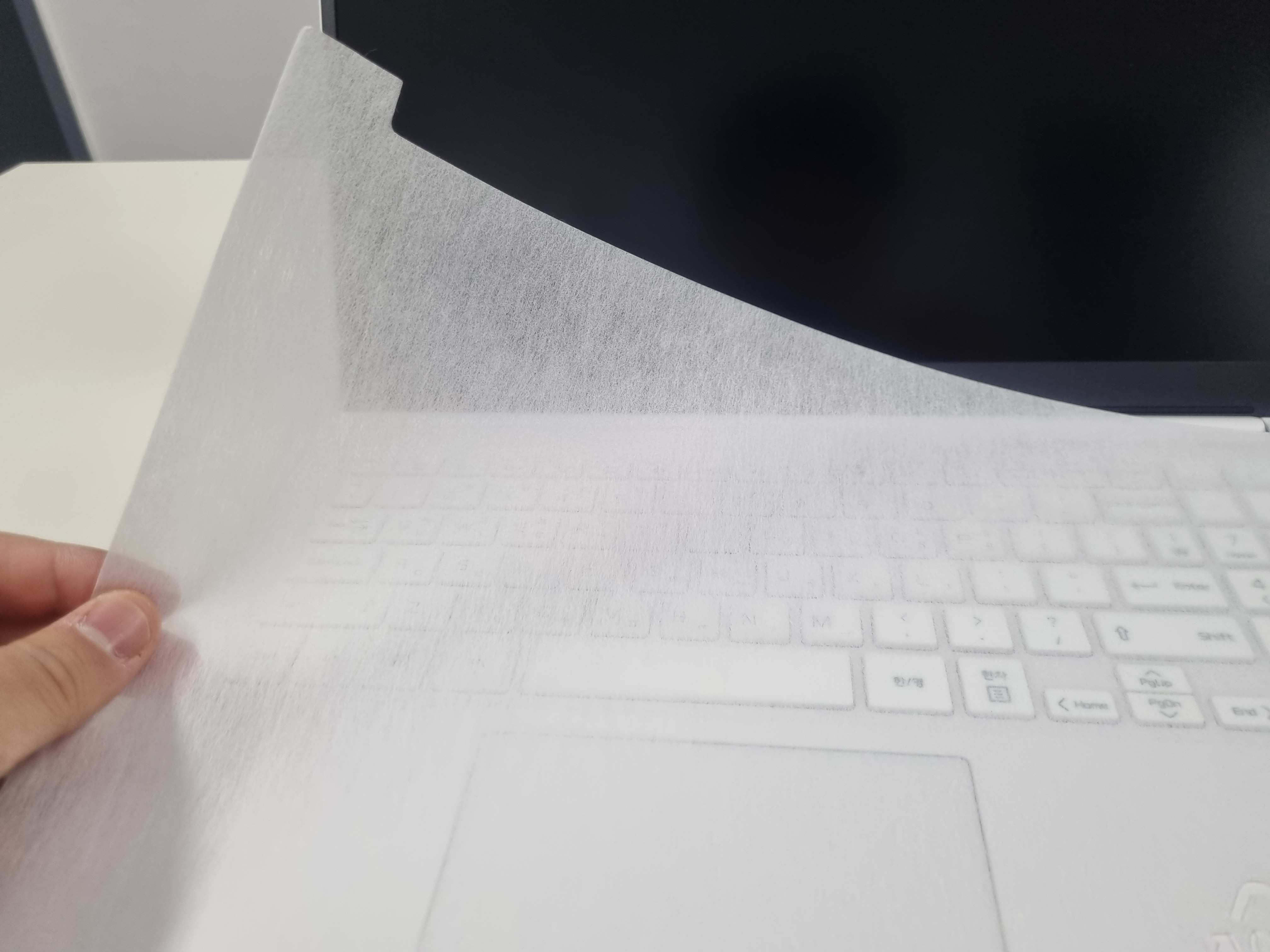 화면과 키보드 사이에 이렇게 보호지가 끼워져 있어요.