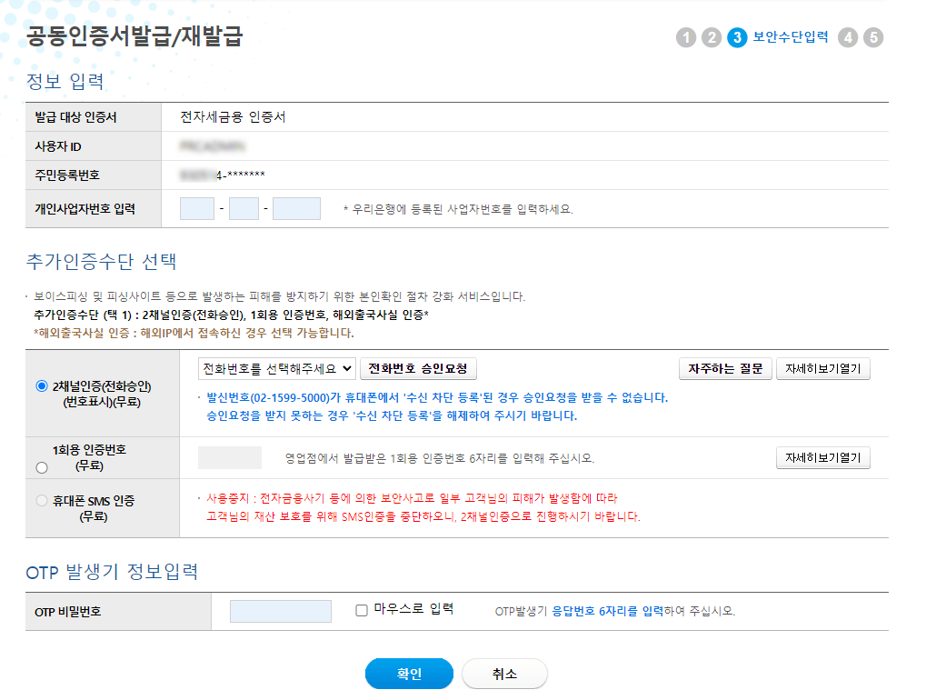 마지막으로 발급 정보 확인까지 마치고 확인을 누르면 우리은행 개인사업자 공인인증서 발급 준비는 끝났습니다!