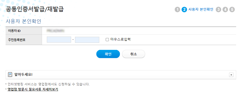 위 절차까지 진행하였다면 이용자 ID는 자동으로 입력이 되어있을 거예요! 아래 주민등록번호를 입력하고 확인을 눌러 계속 진행해 줍니다.