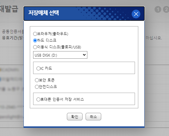 저는 공인인증서 공동인증서만 담아두는 USB가 있어서 이동식 디스크를 선택해 USB에 담아주었어요.ㅎㅎ