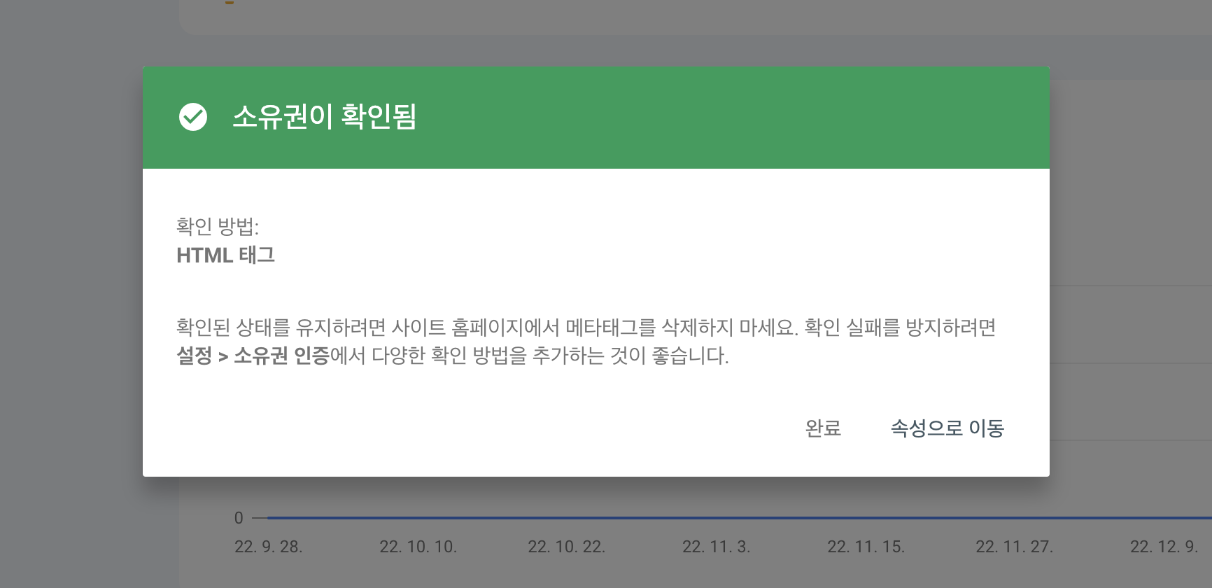 다시 구글서치콘솔로 돌아와 확인 버튼을 눌러주면 잠시 후 이렇게 소유권이 확인되었다는 창이 뜰 거예요!