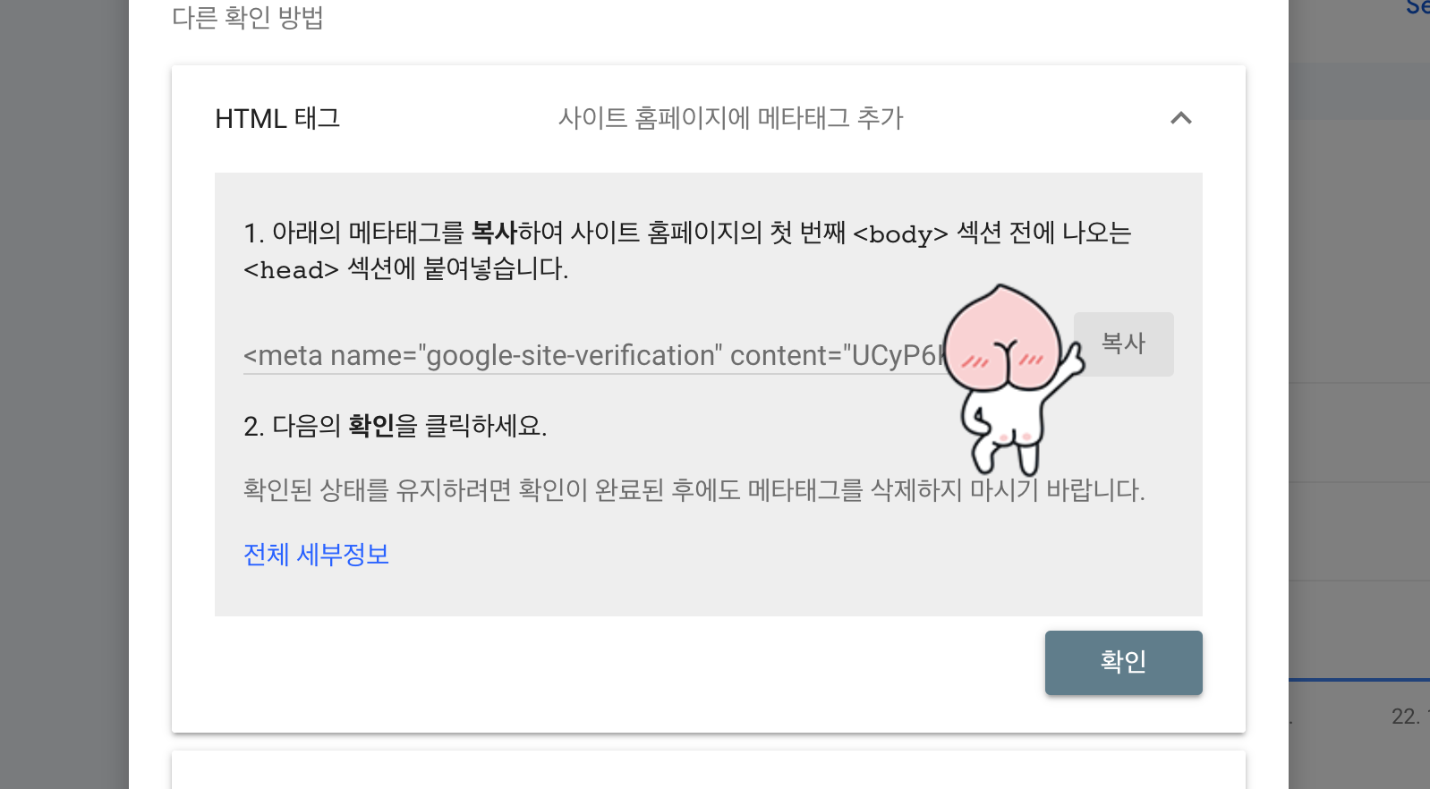 그러면 <meta name="google-site-cerification"... 어쩌구저쩌구 하는 태그가 들어갈 거예요.